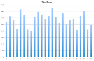 The first is a bar graph I made early on in my writing life to see how much my chapter lengths were varying. (Yes, this was also a case of my number-OCD coming out to play.) Nothing too fancy, just a simple graph in Excel.